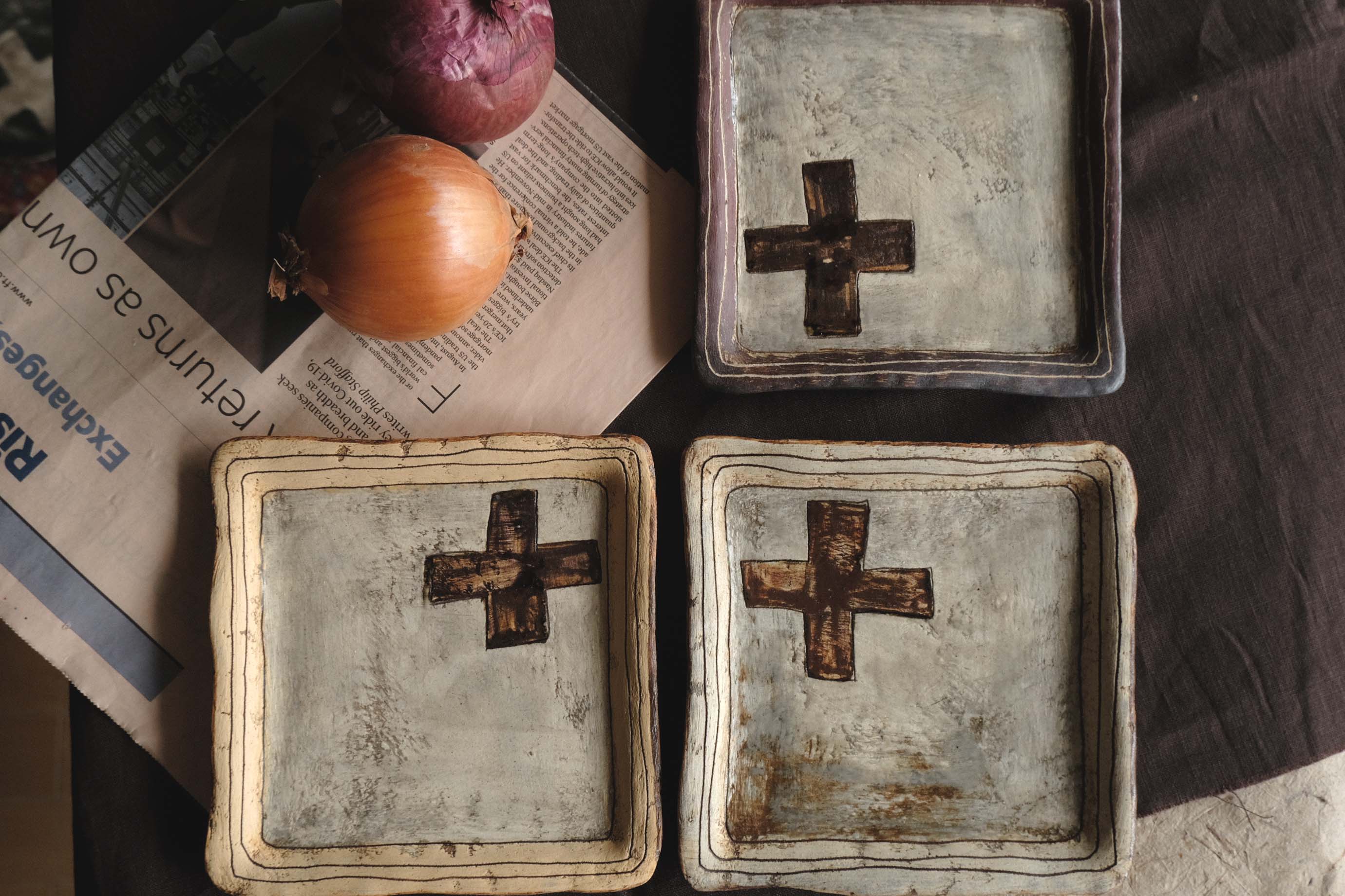 可愛らしい発色と、見込み部分のクロスが盛り付けを楽しくしてくれます。底部分は型で仕上げているので重なりがよく、手で成形したフチ部分は反るような形なので持ち上げやすい仕上げ。全体に化粧泥で汚した感じがアンティークを演出しBORO×BOROらしい一枚です。裏にも遊び心があるので持ち手の満足感を上げてくれますね。ケーキ皿、パン皿に。手触りはマット。