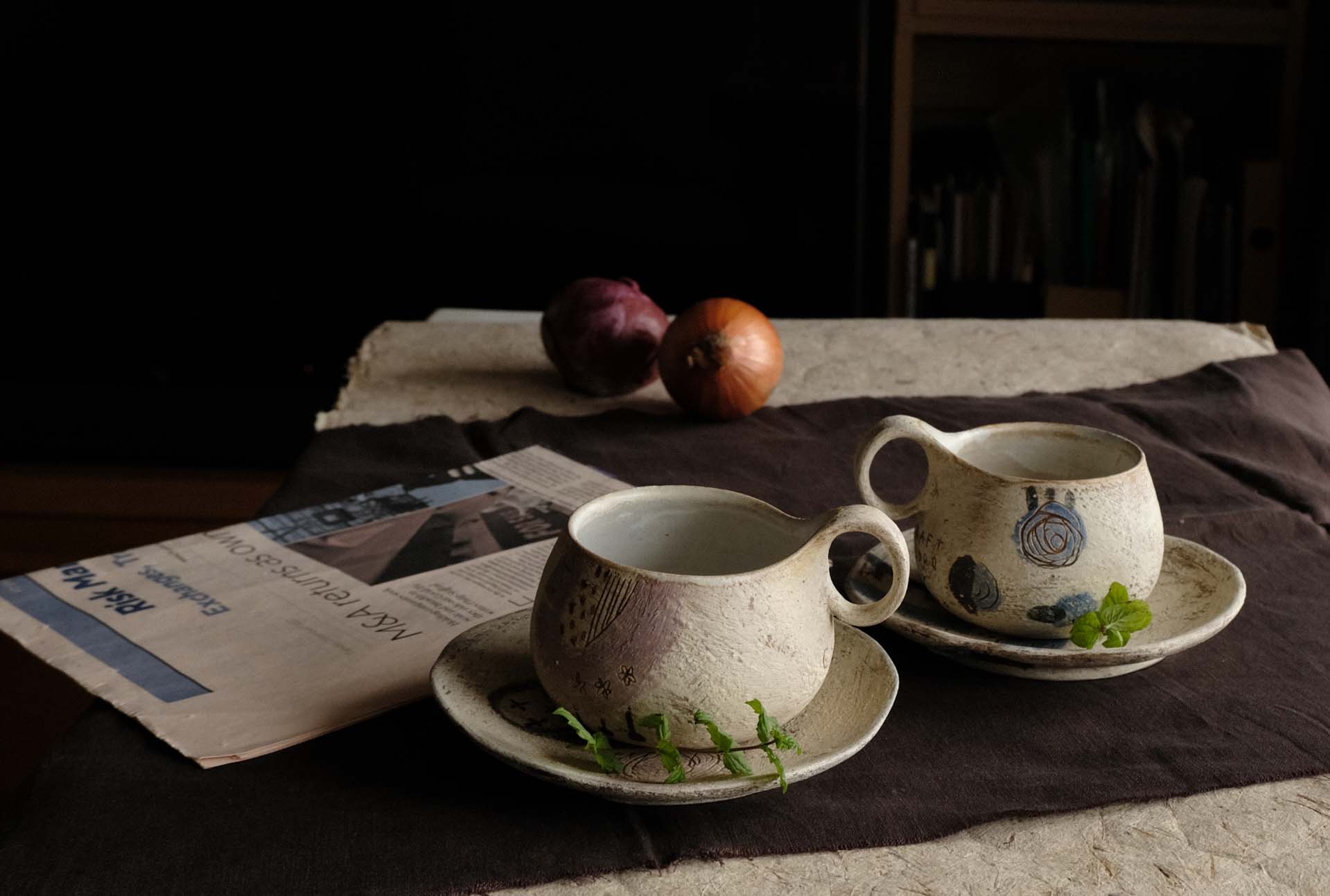 カップとソーサーがお揃いの柄で揃うカップ&ソーサー。どちらも別々に使える事ができるので重宝するアイテムです。カップは約300cc、ソーサーはケーキやスコーンにちょうどいい大きさです。化粧泥の刷毛目とざっくりと描かれたイラストも魅力。手触りはザクっとマットです。