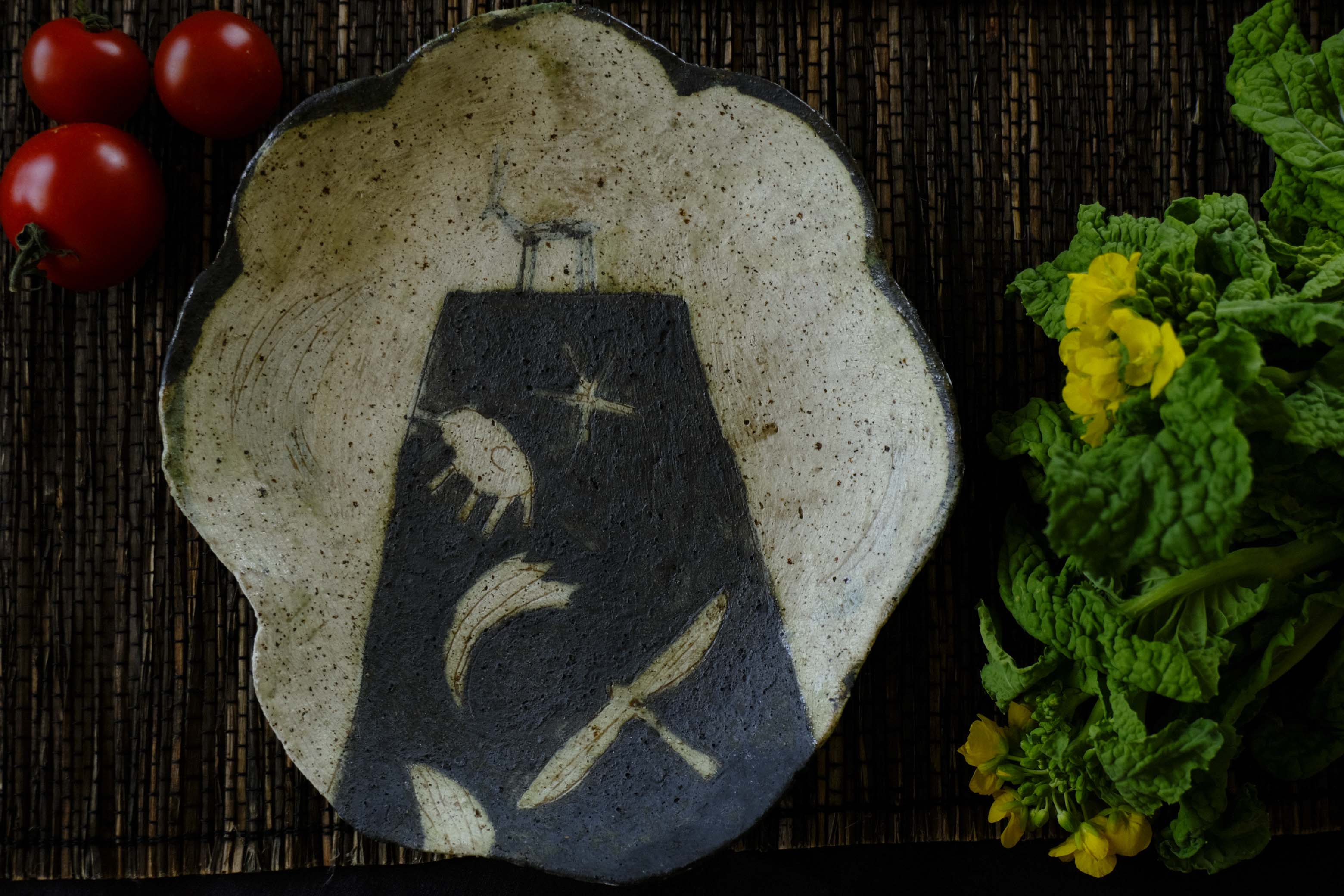 ざっくりとした近江土の風合いを生かした手触り。白化粧を施し、マンガンで黒く色付けされています。まるでモノクロの写真集を見るような、素朴で力強く、大地の土を感じる器です。見込みを彫り削っているので、削った際に石を引きずった跡などの表情も魅力。手触りはザラっとマット。使いやすい大きさの器なので、かっこいい食卓を彩ってくれそうです。器の裏に描かれた詩が器の題名になっています「シュミセン(須弥山)ニハスベテアッテナニモナイ究極ノ空(クウ)
