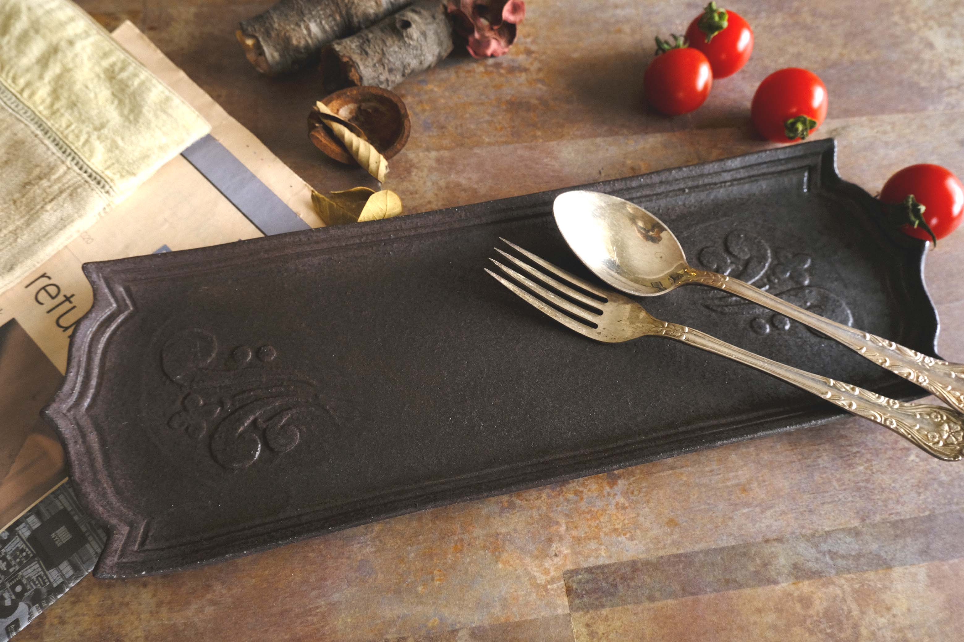 鉄分を含んだ釉薬がアンティークな色合い。ふたつの微妙な色の差は焼成の仕方の違いです。少し赤く発色しているA、カサッとした黒が石のような風合いをも持ち合わせるB。クラッカーに色々のせておいても映えますし、お刺身やお寿司を横に並べても色が映えて素敵です。長細いからからこその盛り付けが楽しめます。手触りはマット。