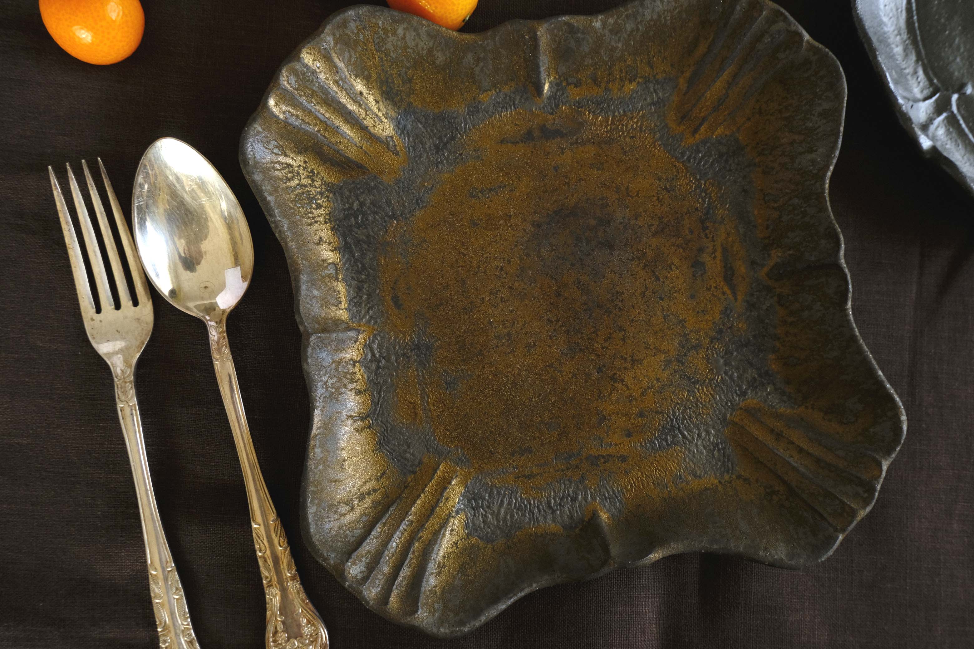 四つ角を集めて持ち上げていた包み紙を開いたかのような、ストーリー性のある美しい四方皿。角に寄せたギャザーと、薄くカンカンと響く質感は、盛り付けを大切なものに仕上げてくれます。ゴールドの釉薬は経年したメタリックのよう。釉薬の溜まりがシボになり黒く発色しているのも表情豊かです。グリルしたお肉やお魚を野菜たっぷりに盛り付けて、素敵な演出をお楽しみください。手触りは釉薬の凹凸を感じるマット。