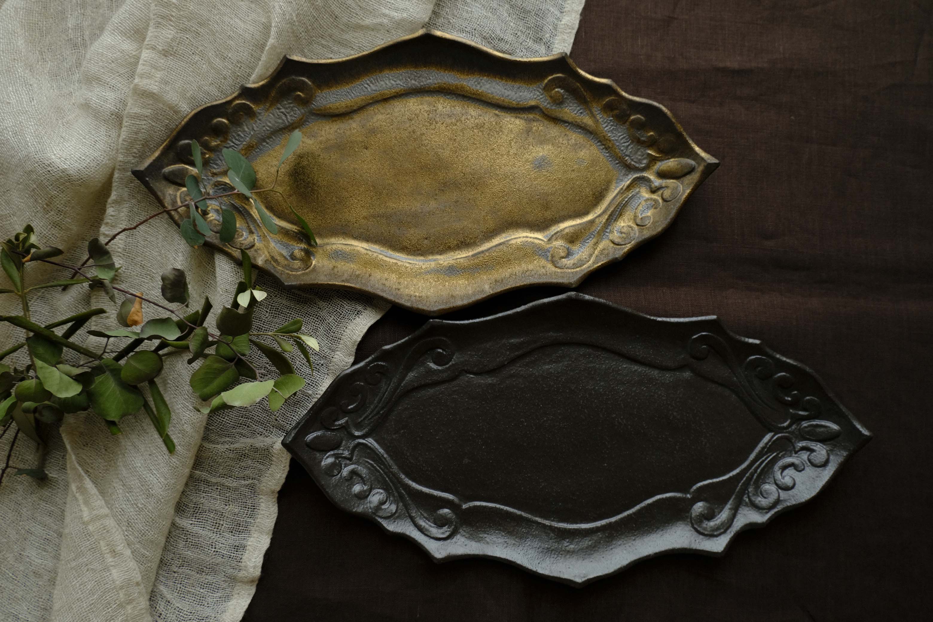 ツルや葉をイメージしたアラベスク模様。模様とリムのカッティングがリンクして華やかな装飾となっています。薄く、重なりもいいのが嬉しいですね。リム部分が上がっているので、プレートではありますが扱いやすいデザイン。見込みからリムにかけての切り返しもあるので、まるで額縁に入れるように盛り付けができます。ゴールドの釉薬は渋いアンティークな光、そして釉薬の溜まりが黒くシボが寄っているのも表情豊かに。手触りはマットです。