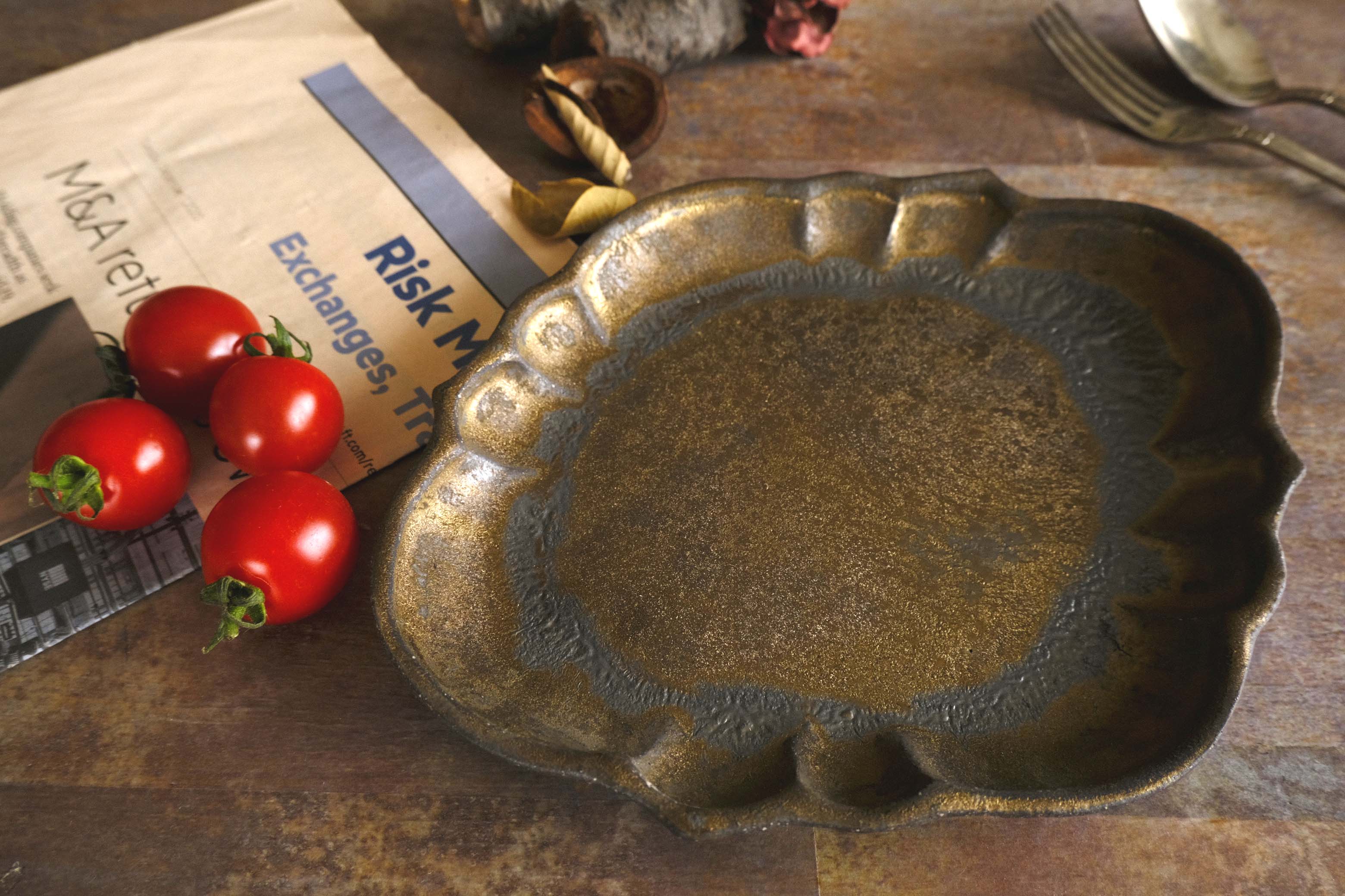 釉薬の濃淡で出た発色はゴールドと渋い黒。黒は釉薬の溜まりでシボがよりカッコいい風合いです。ゴールドは光があたるとキラキラときらめきます。リム部分が斜めに立ち上がり、フリルなどに光が当たりやすいので、優雅な食卓を楽しんで。手触りは釉薬の凹凸を感じるマット。