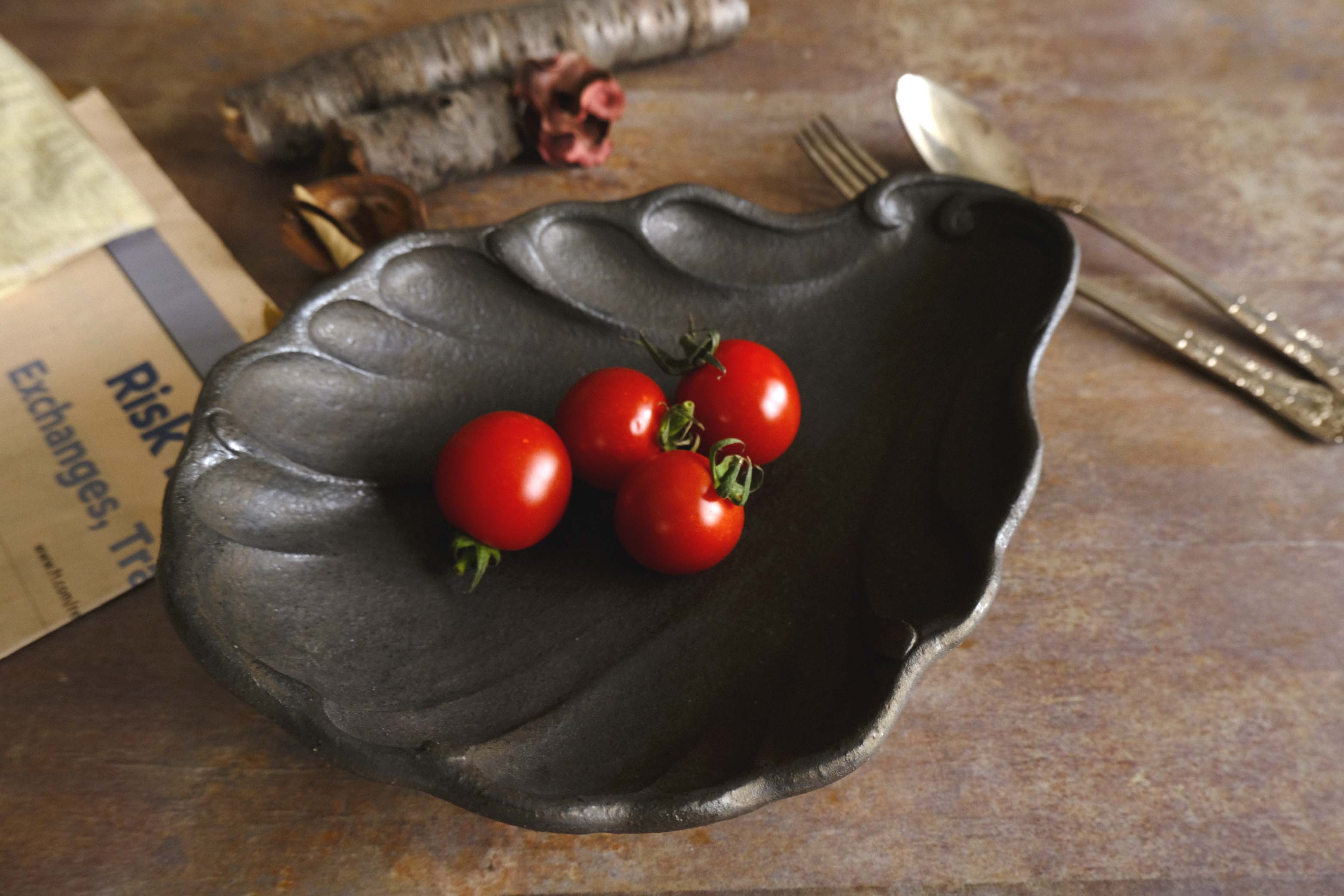 ヴィーナスの貝のような、波に揺られるように設置面が小さく、横からのラインも斜めになっている鉢。中央に盛り付けが寄るので、葡萄や、トマトなどのコロコロしたものも収まりがいい器です。リムから中央に向かった曲線も美しく、光による影が雰囲気を盛り上げます。手触りはマット。