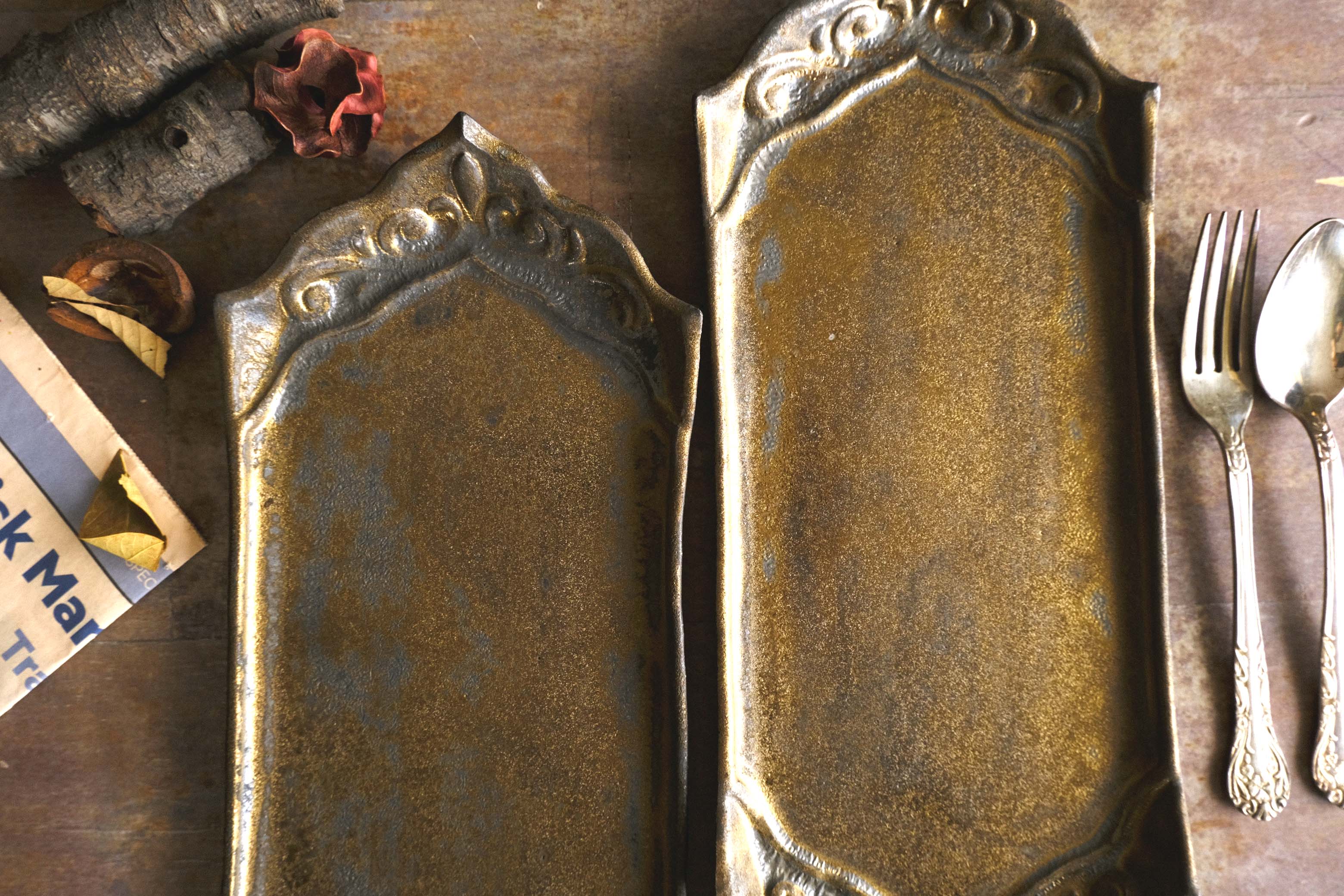 ツルや葉をイメージしたアラベスク模様。模様とリムのカッティングがリンクして華やかな装飾となっています。薄く、重なりもいいのが嬉しいですね。リム部分が上がっているので、プレートではありますが扱いやすいデザイン。ロールケーキをのせてもよし、ローストビーフを切り分けてもナイフの入りやすいリムの高さです。ゴールドの釉薬は渋いアンティークな光、そして釉薬の溜まりが黒くシボが寄っているのも表情豊かに。手触りはマットです。