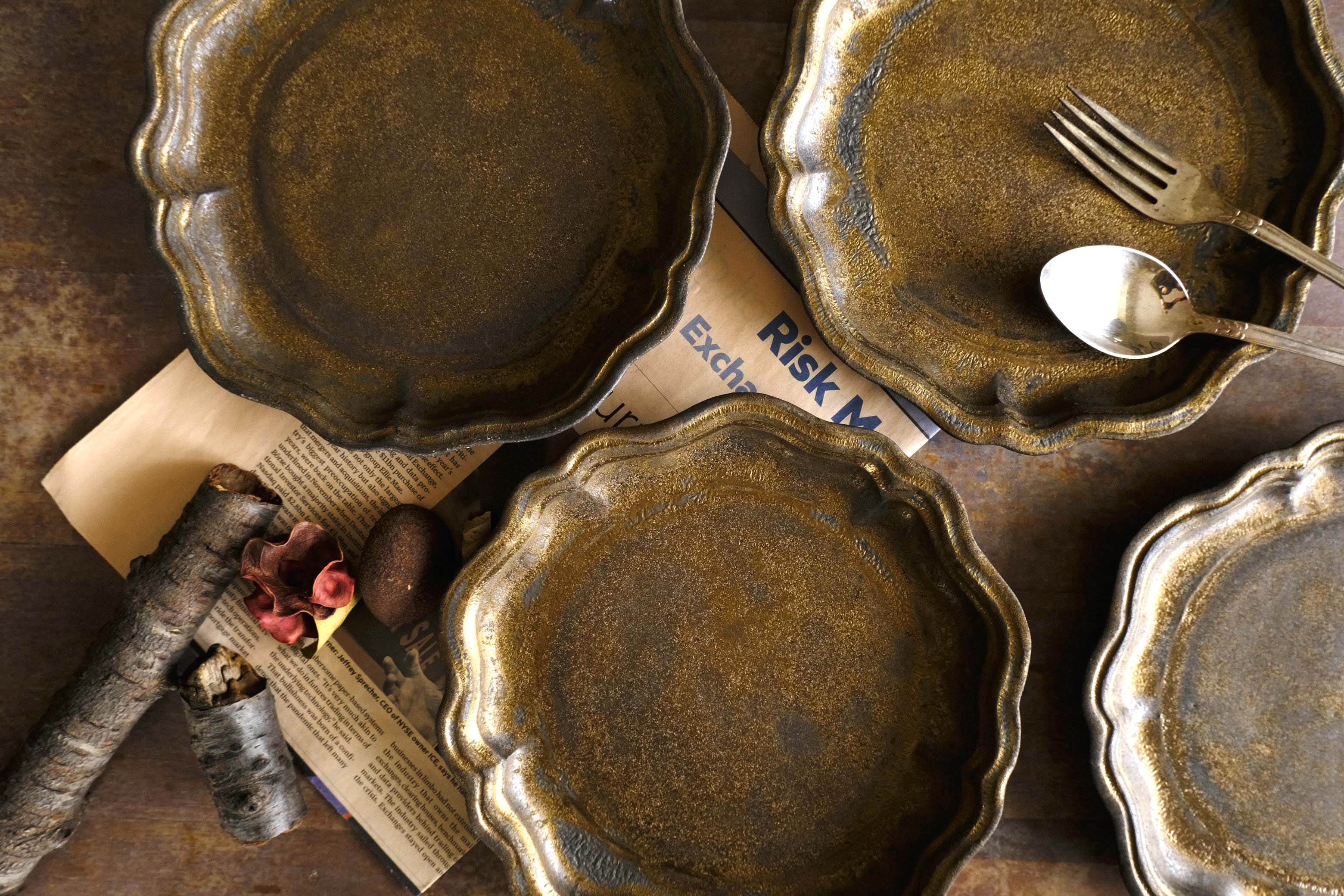 による景色は美しいの一言。光に当たると渋い金が輝き、器のラインを浮かび上がらせてくれます。Hは薄くゴールドの釉薬を塗ったもの。厚めの釉薬にゴールドの釉薬の刷毛目、さりげない光が渋い色合いです。リムとの切り返し部分は厚めの