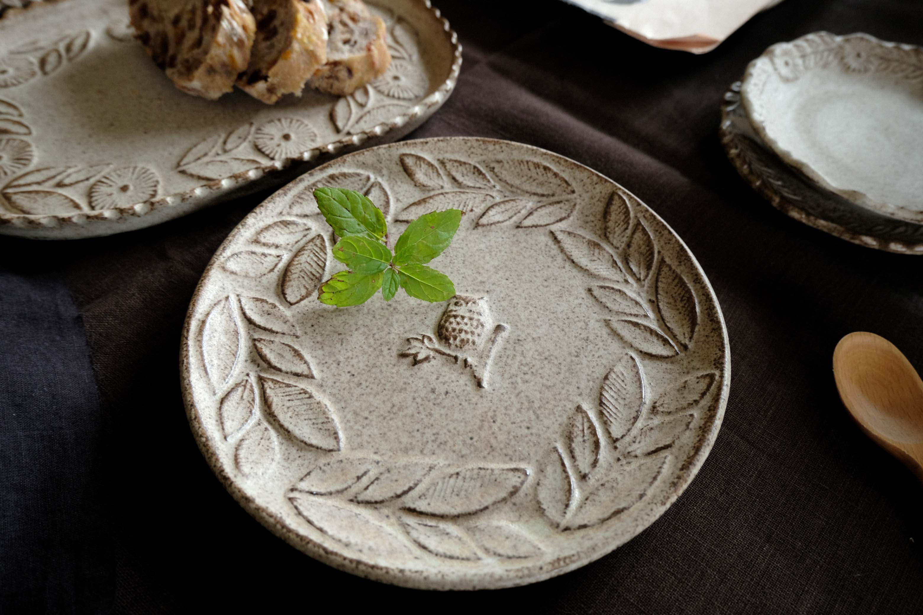 はっきりとした模様は一つ一つ型で抜き出したものを貼っているから。それだけに印影が美しく食材を豪華に魅せてくれます。中央のフクロウはただレリーフのように凹凸になっているのではなく、フクロウの丸みのあるふくらみや枝の円柱などまでが表現されています。中央にケーキを盛り付けたり、色鮮やかなサラダもピッタリです。手触りはマット。陽の光によって、グレーに見えたり、肌色に見えたりするのも楽しめます。