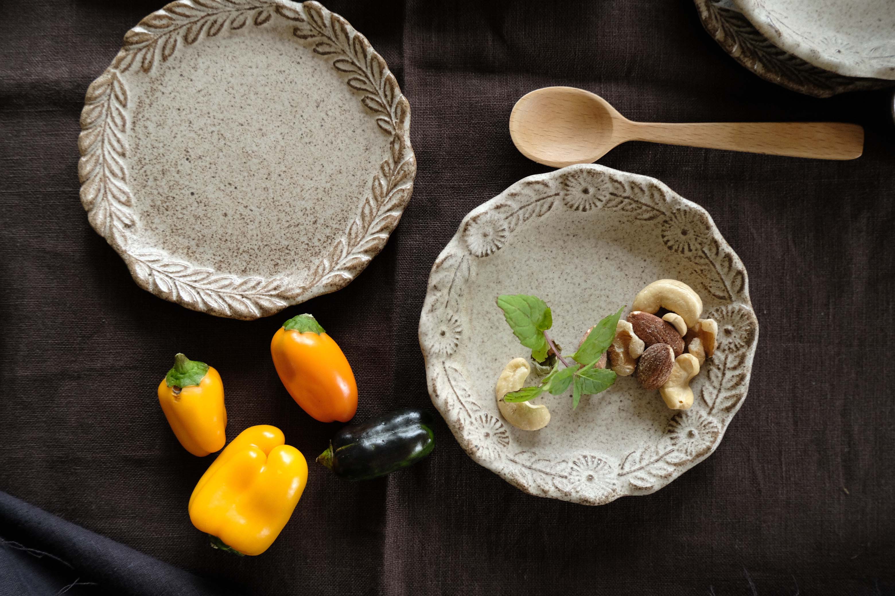 はりだしたリムの模様を豪華にいろどった皿。模様が立体的に飛び出している美しい縁が魅力です。お醤油皿やカトラリー置き、アクセサリー置きにもぴったりです。「花」の方が立ち上がりが湾曲して「葉」より高くなっています。美しい模様の凹凸は釉薬の濃淡で輪郭が美しく浮かびあがり、盛り付けが映えます。陽の光によって、グレーに見えたり、肌色に見えたりするのも是非楽しんで。手触りはマット。