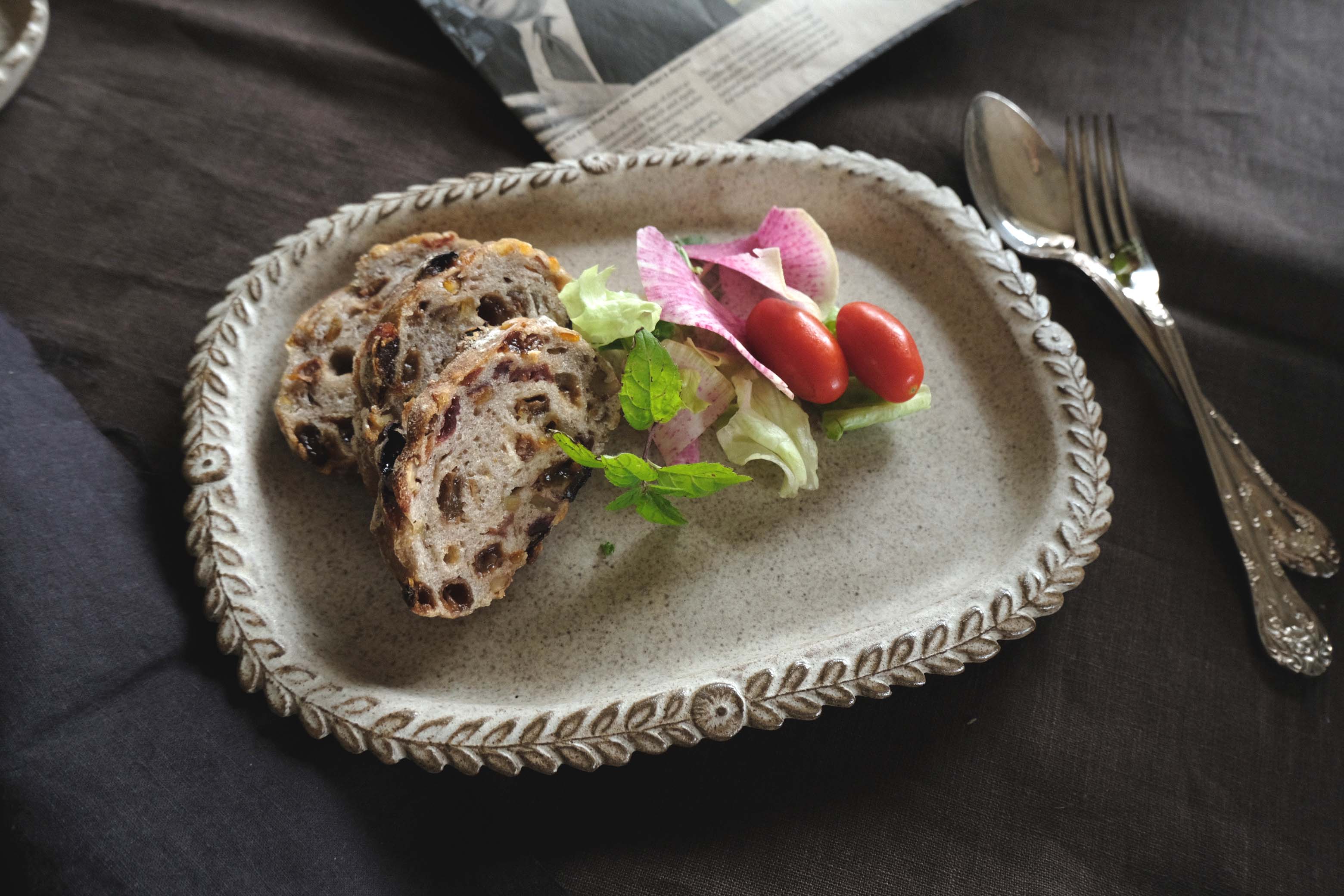 くっきりとしたフチの葉と花のモチーフに釉薬の濃淡がアンティークな風合いの四角皿。縁が立ち上がっているので、盛り付けしやすく、リム部分も持ち上げやすいのでサーブしやすい作りです。パンと卵など、朝のワンプレートとしても活躍。型で作られているので、重なりもいいのが嬉しいですね。手触りはカサットマット。光の加減でグレーにも肌色っぽくも見えるので、その変化も楽しめます。