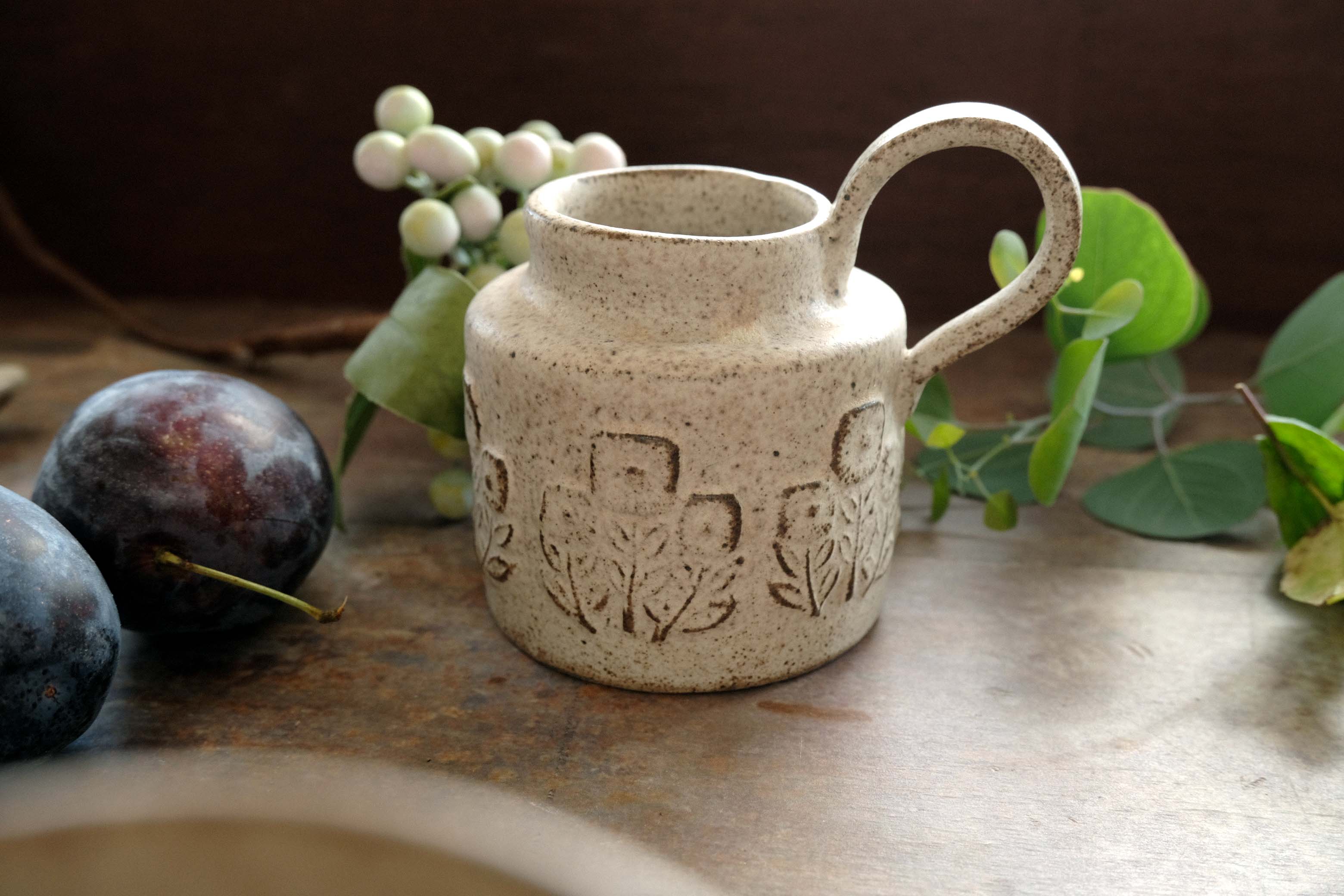 上に上がった取っ手がアンティークでゴージャスな印象の花器。ほぼ同じサイズと形ですが、Aは肩の部分が少し下がり、Bは丸みを帯びた印象です。Cは少し細長い印象のフォルム。盛り上がった花が同色でも釉薬が凹凸に溜まる事で輪郭が見え、そのさりげなさが可憐です。活けたお花が優しく感じる花器です。