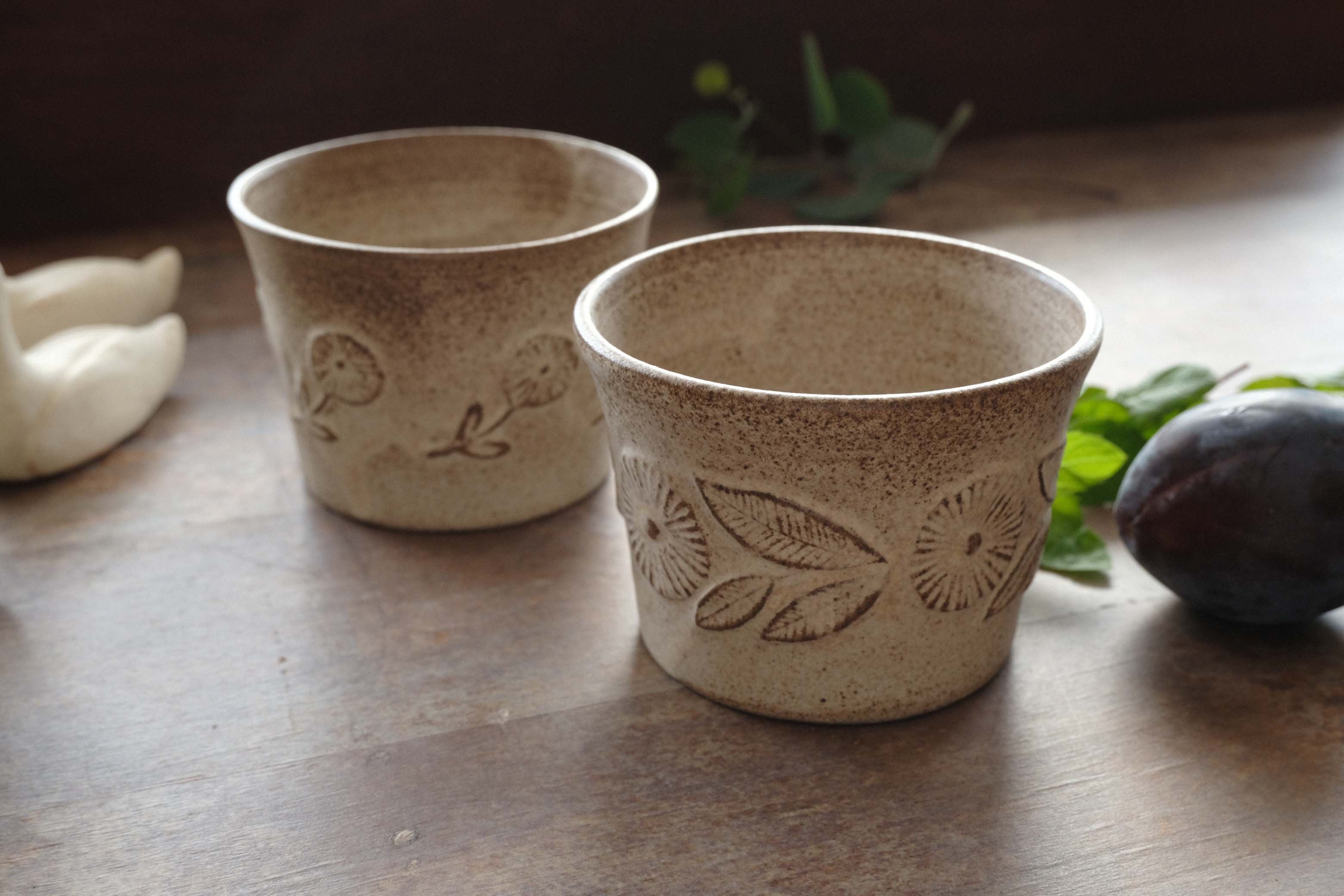 一番活躍する形のフリーカップ。毎日のコーヒーやお茶のカップとしてはもちろん、コロコロした葡萄をいれたり、ヨーグルトを入れたり、そば猪口にもと万能な形です。3種類の模様があるので、家族で柄を変えてもいいですね。注目すべきは裏の高台。ほぼ厚みがなく線のように削る細かい気遣いがみられます。手触りはマット。