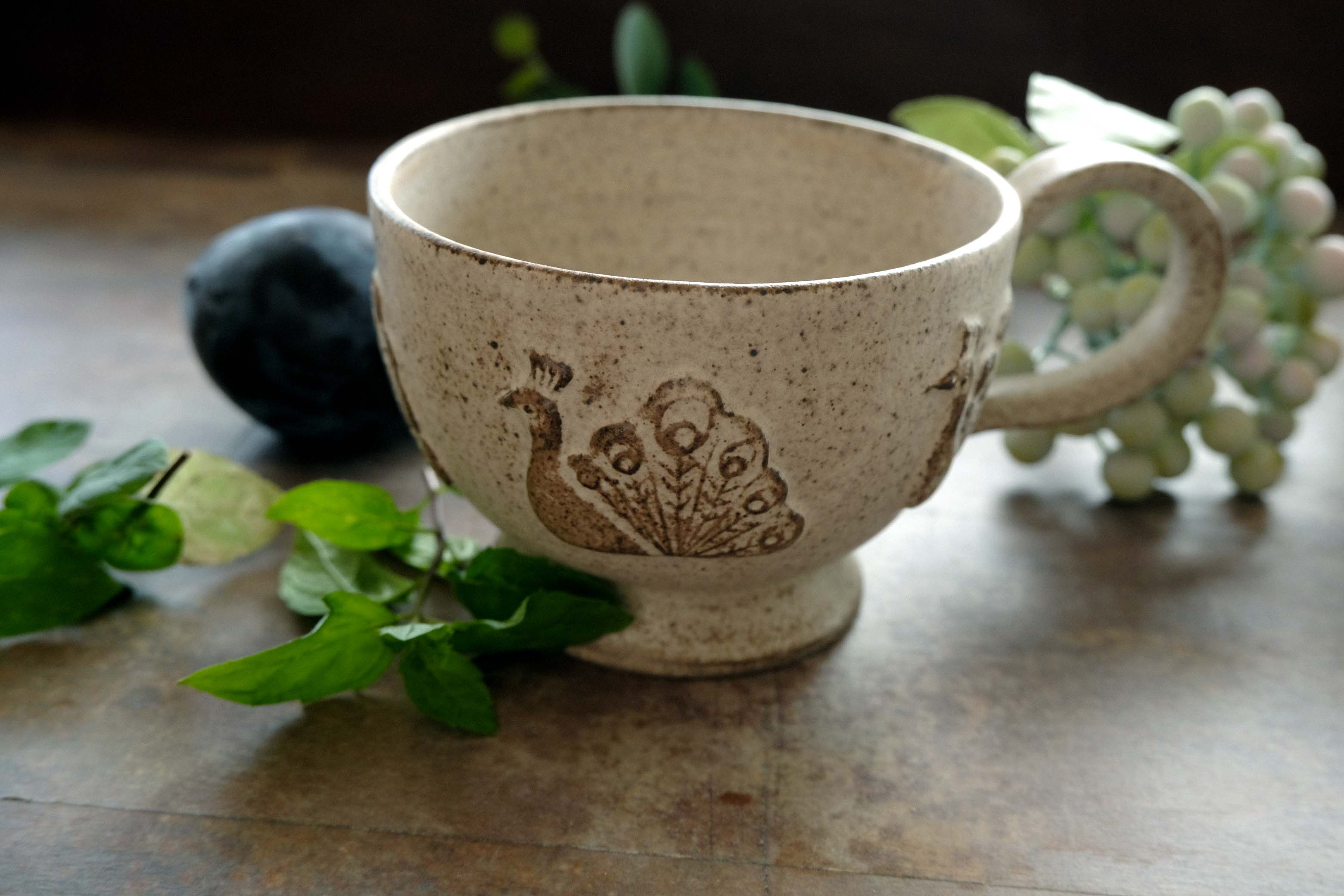 高い高台が付いたマグカップ。大きく張り出した取っ手がゴージャスな雰囲気にしています。くじゃく、ちょう、型で抜いたモチーフを丁寧に貼り釉薬の濃淡がモチーフを浮かび上がらせています。容量が250cc(満杯)としっかりあり、アンティークな茶色は紅茶やミルクティーが良く映えます。手触りはマット。