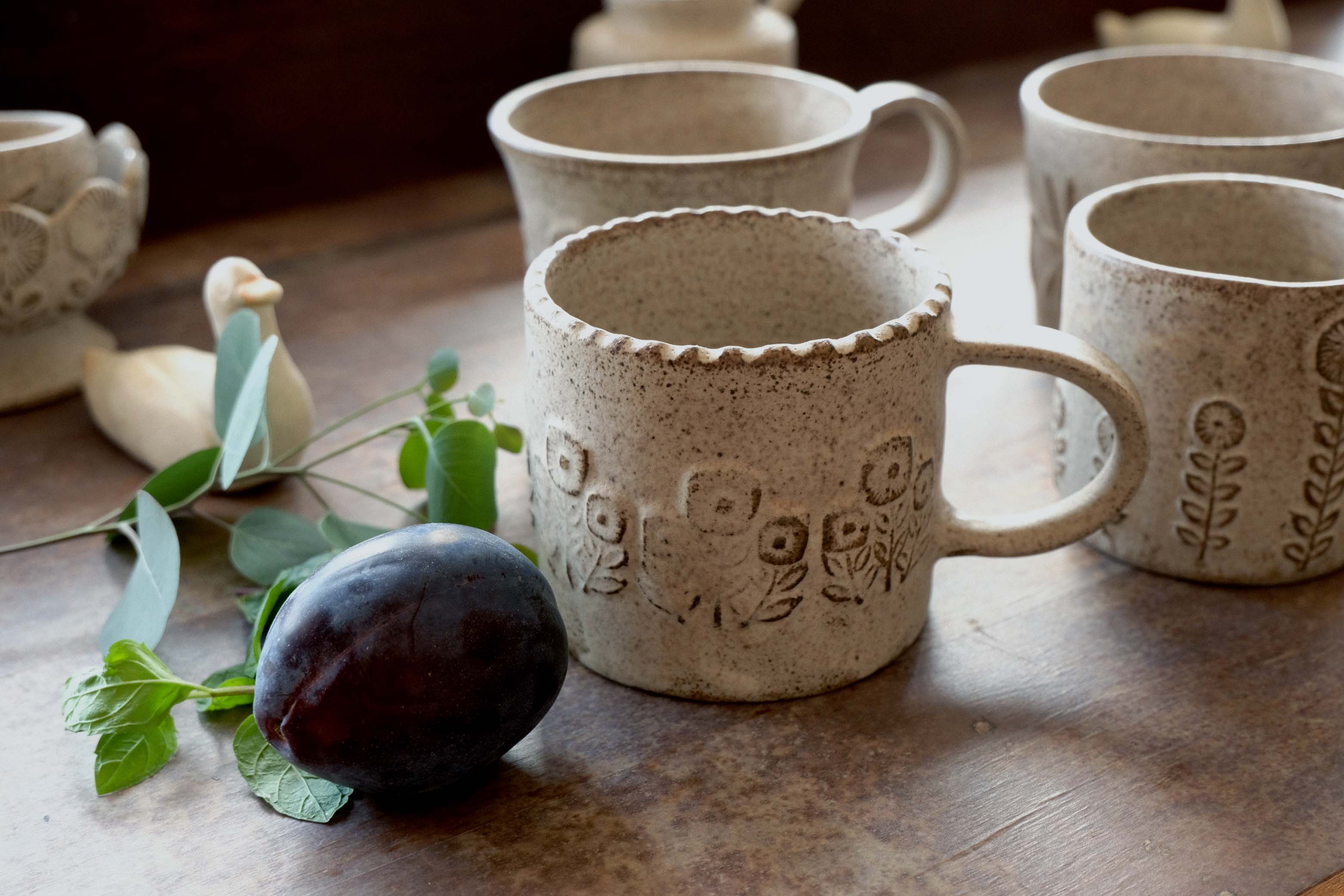 いろいろな形のマグカップ。どれも優しい発色の中に浮かびあがるモチーフが柔らかい雰囲気です。一つ一つ型で出したモチーフを貼るという手間のかかる制法。