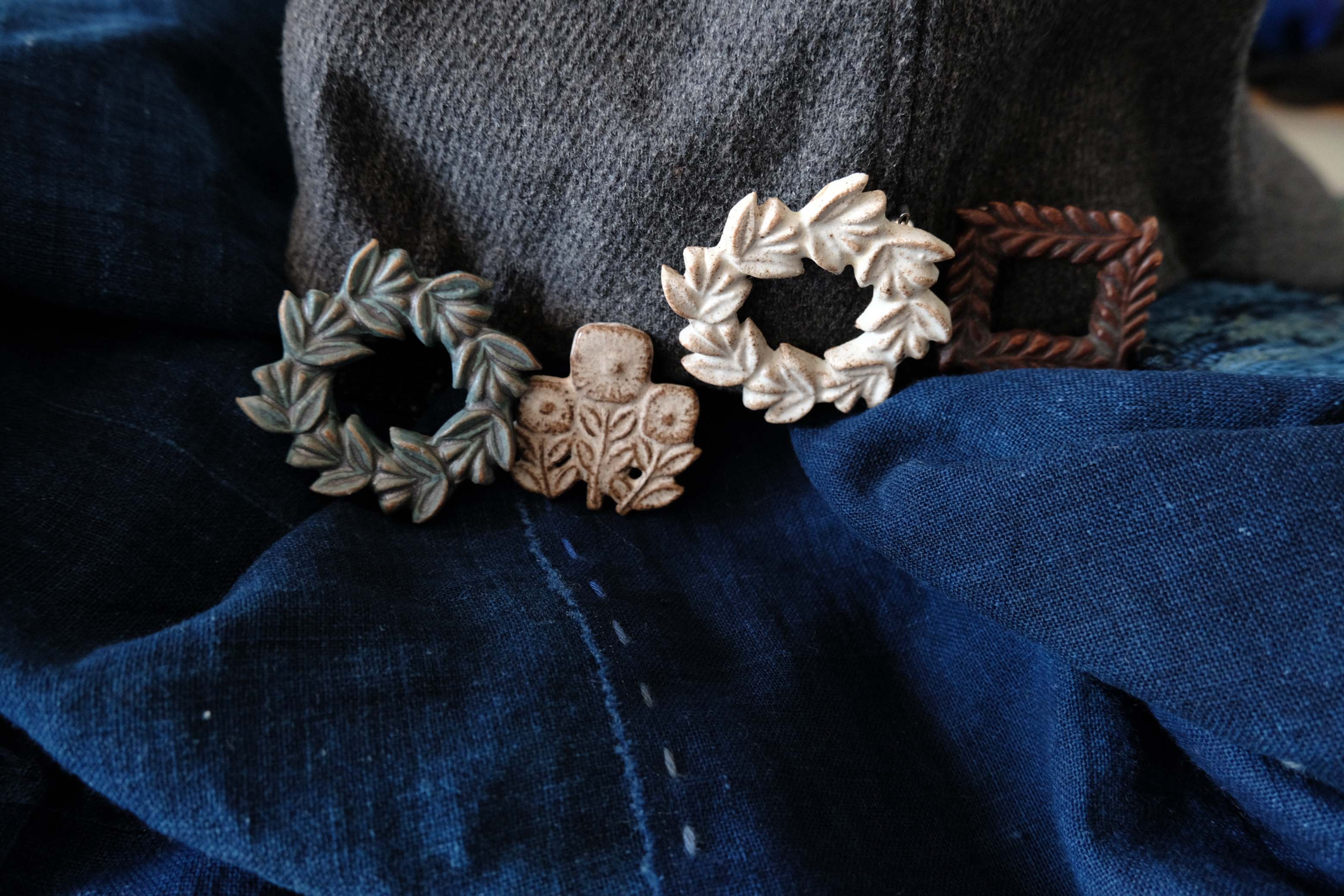 fuji-galleryの人気のブローチがオンラインでも。小さくて軽いので、帽子やシャツのワンポイントにぴったりです。優しい色合いと表情は手作りならでは。一つだけ付けても素敵ですが、二つ、三つをストーリー仕立てにつけて楽しむ事もできます。木とくまと星で、森の夜を表現してみたり、ちょうと花で野原を表現してみたり。いつものお洋服やカバンにストーリーをプラスしてみてください。手触りはマット