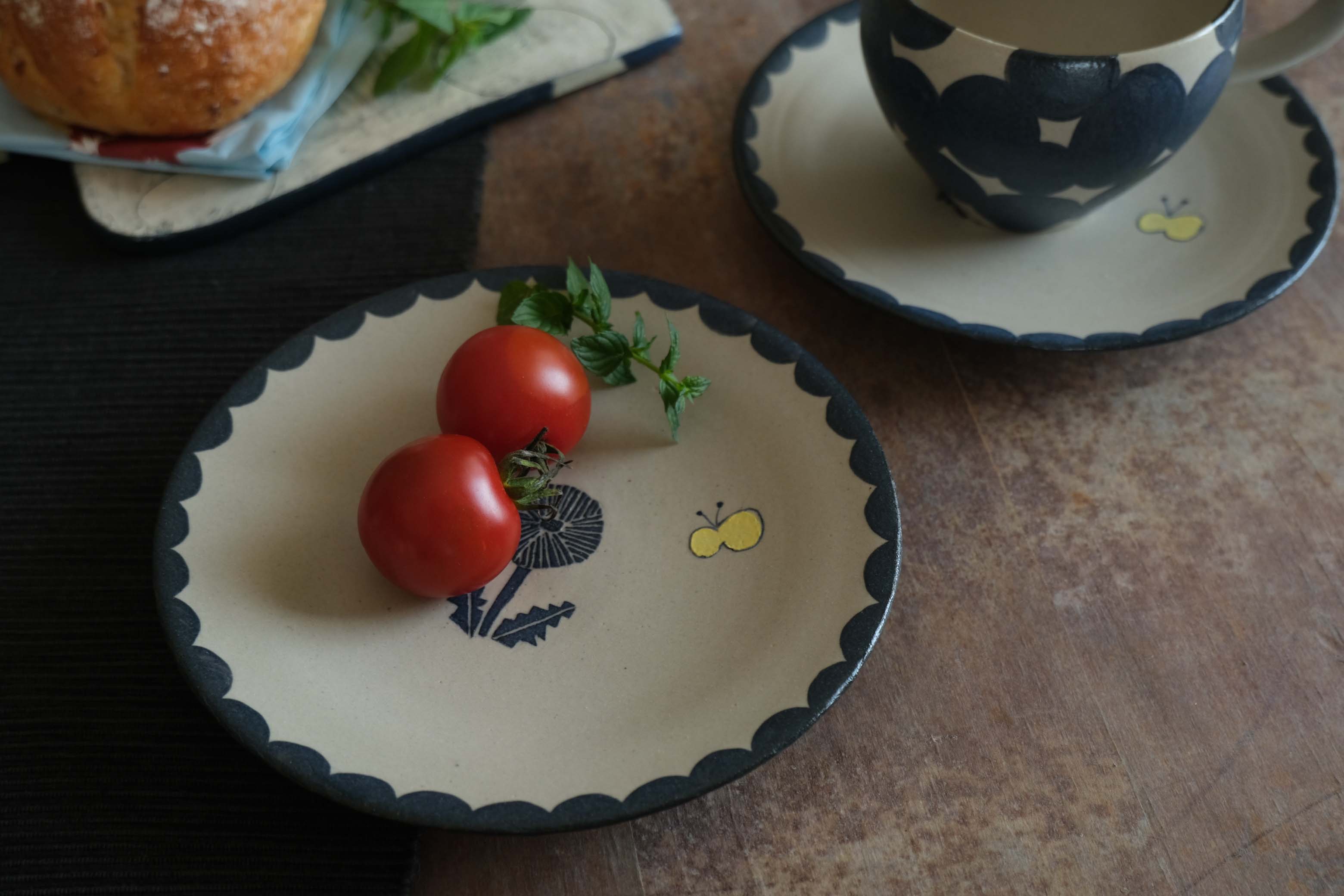 グレー地に紺のタンポポとフリルの縁取りが大人可愛いプレート。一見モノクロに見える中に黄色の蝶がポイントです。端正にロクロで仕上げられた薄いプレートはパン皿、ケーキ皿にぴったり。同じ土で作られたカップを合わせるとC&Sになります。手触りはマット。