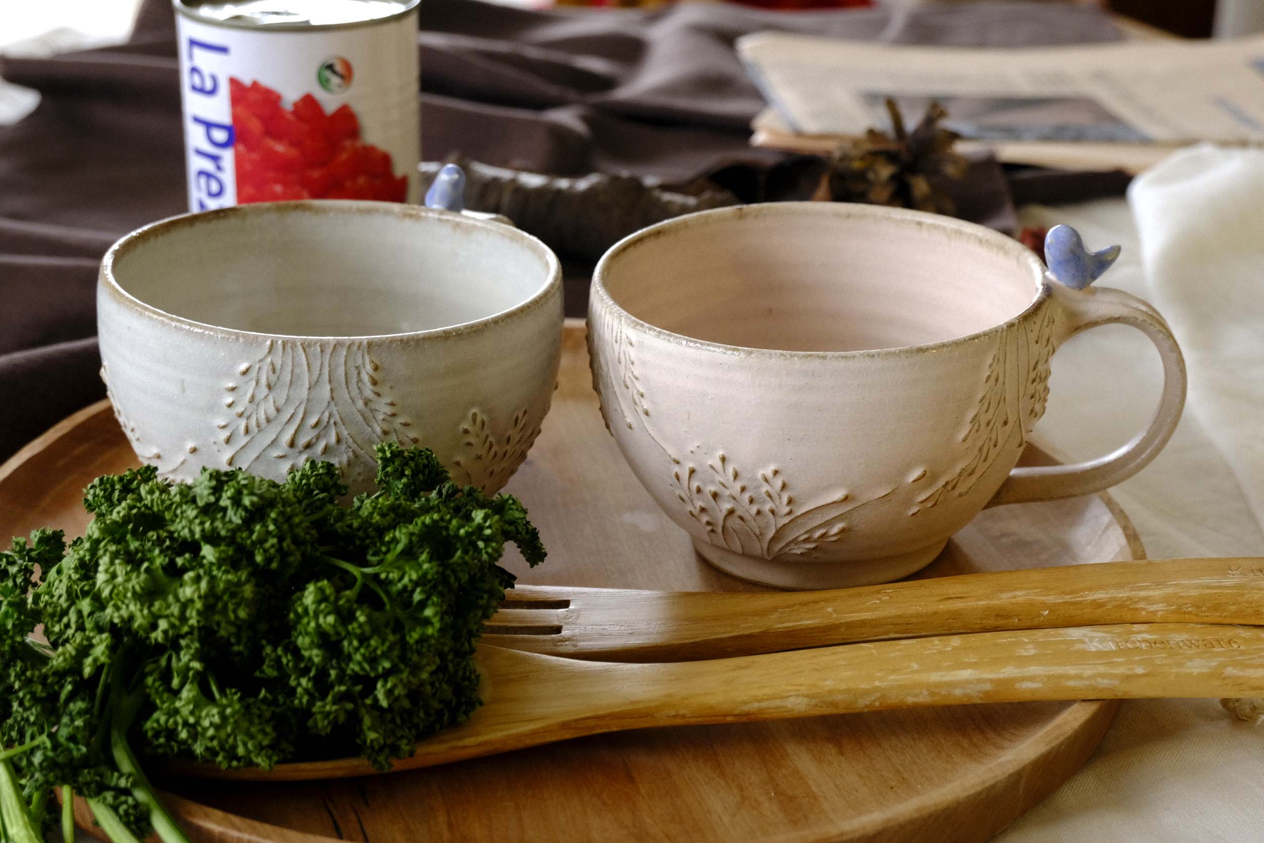 小鳥が取手にちょこんと乗った大きめスープカップ。大きいカップながら、しっかりとした平らな取手が安定感を出してくれています。小鳥は一つ一つ手で形成しており、ツンツンとクチバシが手にあたると、何かを語りかけられているかのような優しい気持ちになります。まるで器の中をのぞきに来たかのようなストーリー性が楽しめます。表面はイッチンで描かれていて、作家の世界観が広がります。手触りはマット。