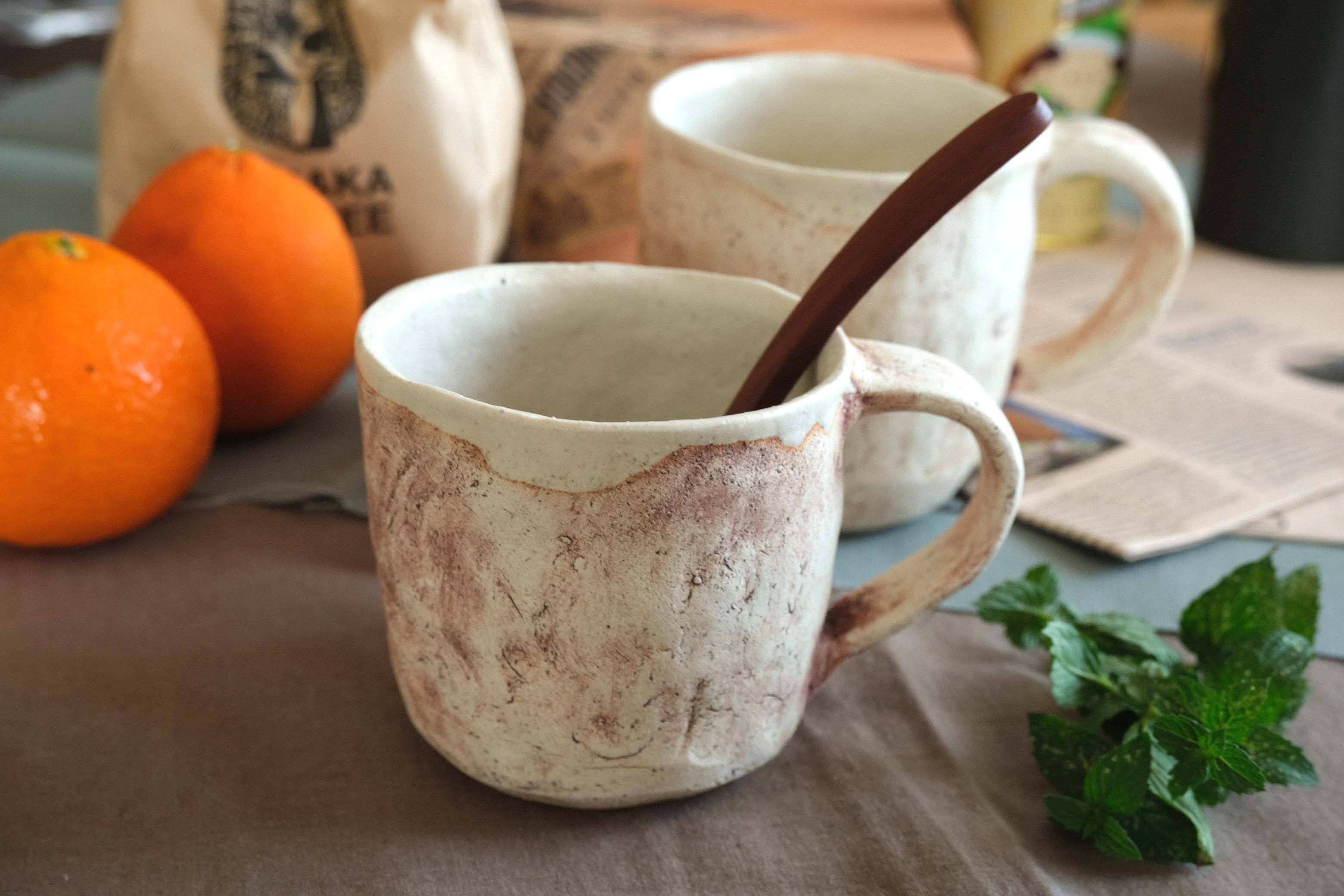 手びねりで形成された器。きゅっきゅっと土を締めながら形成されていく行程をそのまま残し弁柄で色付けし焼しめた外側はカサッとマットな手触りに、内側はヘラで均していますが、程よく手作り感の手跡を残し半透明マット釉で仕上げています。飲み口が内側に入り込むように斜めになっているので口あたりがいいのも嬉しいですね。コーヒー、カフェオレ、飲み物が映えるカップです。