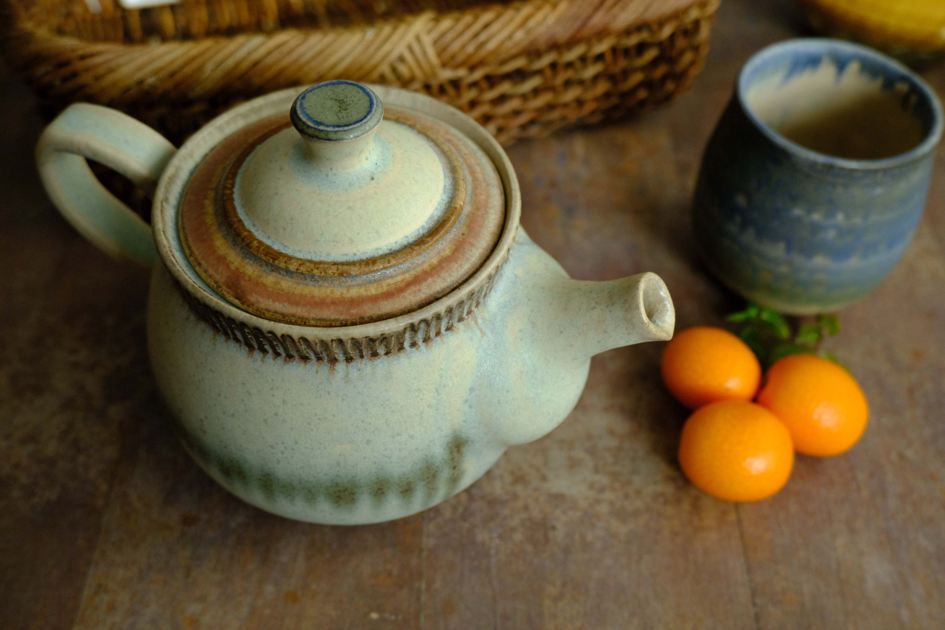 丁寧に作られた美しい形のティポット。蓋の傾斜も二段階に分けられ、ポット上部にはしのぎが入れられています。しのぎと対になるように下の方には釉薬でラインが。取っ手も葉のような形と凝った仕上げです。余計な装飾や色を加えず、全体のバランスとフォルムで魅せたポット。茶こしが付いた600ccの容量も魅力です。手触りはマット。