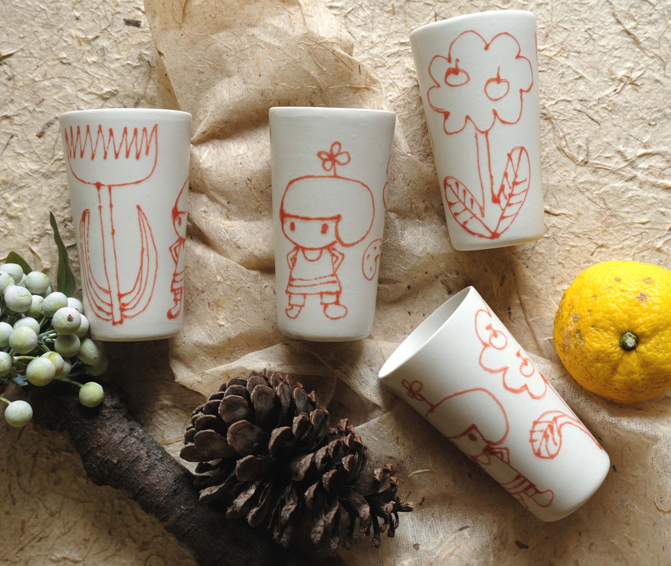 白地に赤で勢いよく描かれたイラストが印象的な細カップ。サブタイトルが「赤い花のせい」とあるように、生意気そうな可愛い妖精が描かれています。それぞれお洋服やお花の葉部分が違っているので、いくつか揃えても楽しいですね。手触りはサラッとマット。お酒のカップとしても、高級トマトジュースやホットチョコレートにもピッタリ。細さを利用して一人分のカトラリーケースとしてナプキンと一緒にセットしても素敵です。