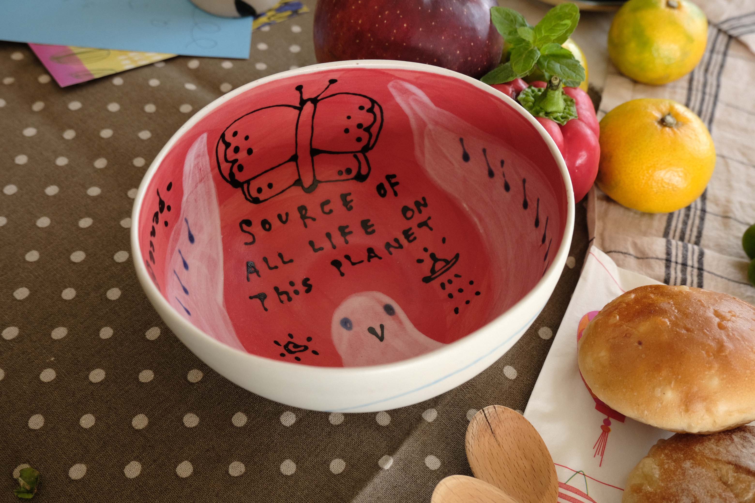 まるで卵を半分にしたような深楕円鉢。りんごのような赤一色の中に白いハトが描かれています。どの方向から覗き込んでも楽しい絵柄と文字。外側にはクレヨンのように楕円が書かれているので、横からも景色も楽しめます。白と赤のコントラストが可愛らしいボウルです。手触りはカサッとマット。