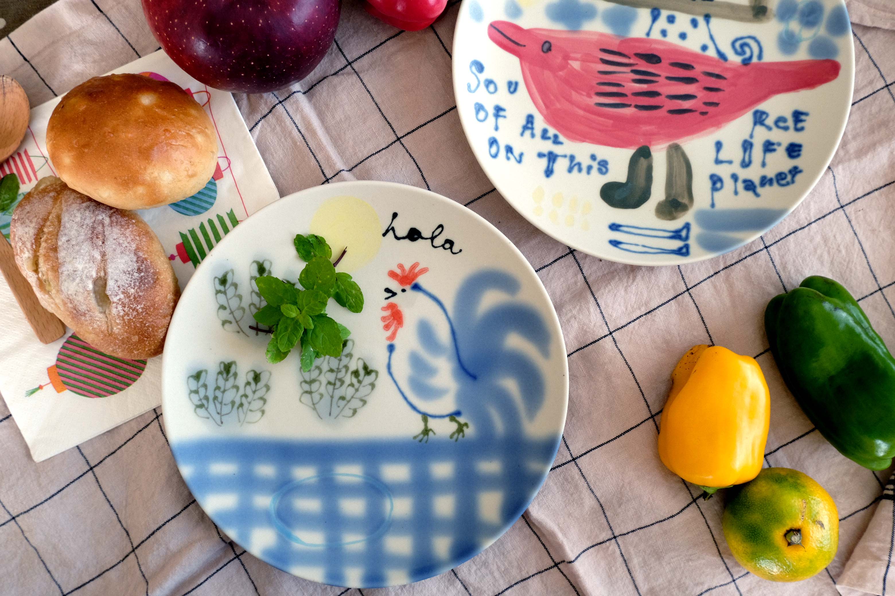 白いキャンパスに楽しく思うがままに絵を落としこんだような中皿。透過性のある顔料が器の裏まで模様をにじませ、高台の裏に可愛らしい遊び心がのぞきます。ケーキ皿、取り皿、朝のプレートとしても楽しい時間をスタートさせるのにふさわしい一枚。手触りはサラッと。