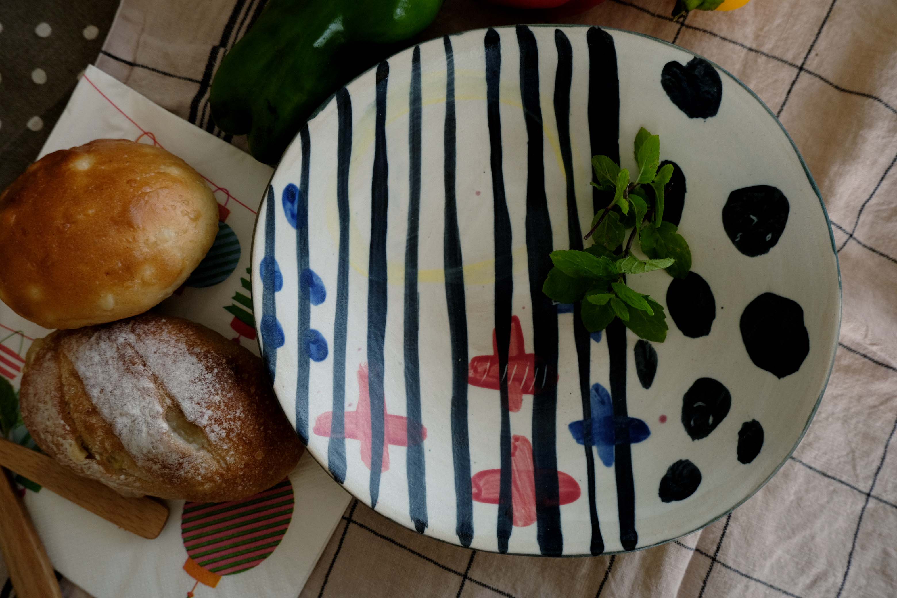 色をのせ、洋服のテキスタイルのような絵柄の楕円鉢。ほどよい重さもあり、果物をのせてテーブルに出しっぱなしにしていても素敵な器です。出触りはガサっとマット。裏を返しても楽しい器は、お片付けの時間も楽しませてくれますね。