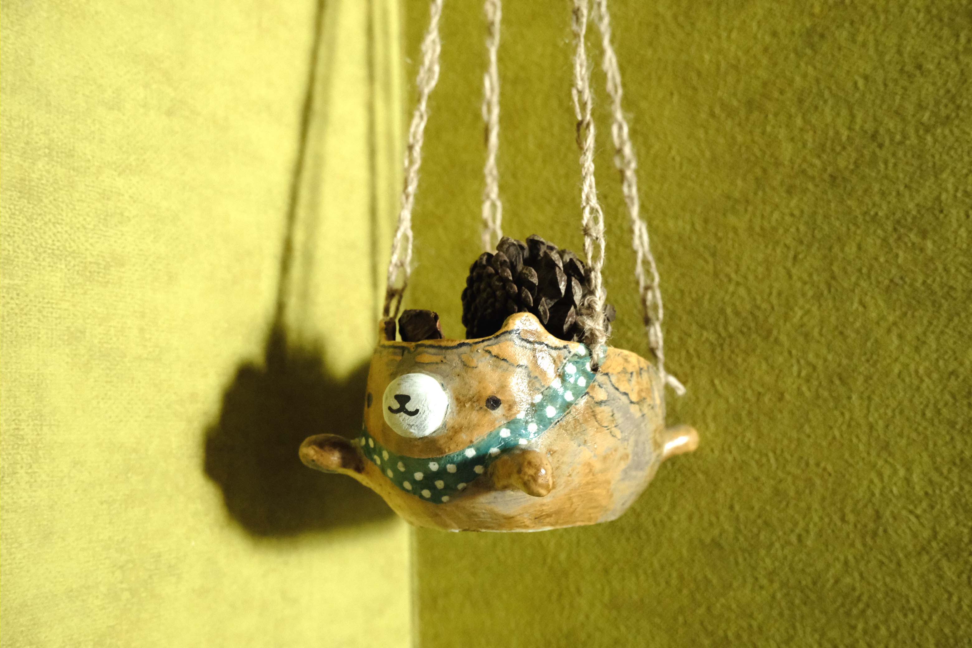動物たちが空を飛ぶモチーフの植木鉢。きちんと穴があいているので、根腐れの不安もなく、いろいろな飾り方を楽しめます。作家が麻紐を編んだ釣り糸も可愛らしいポイント。雑貨入れとしても、内側に模様があるのが見え隠れするので可愛いですね。下から見上げた時のフォルムもキチンと考えられていて、足の裏には肉球が見えます。ふっくらとした表情とボディはどこの角度からみても癒されフォルム。手触りはマット。