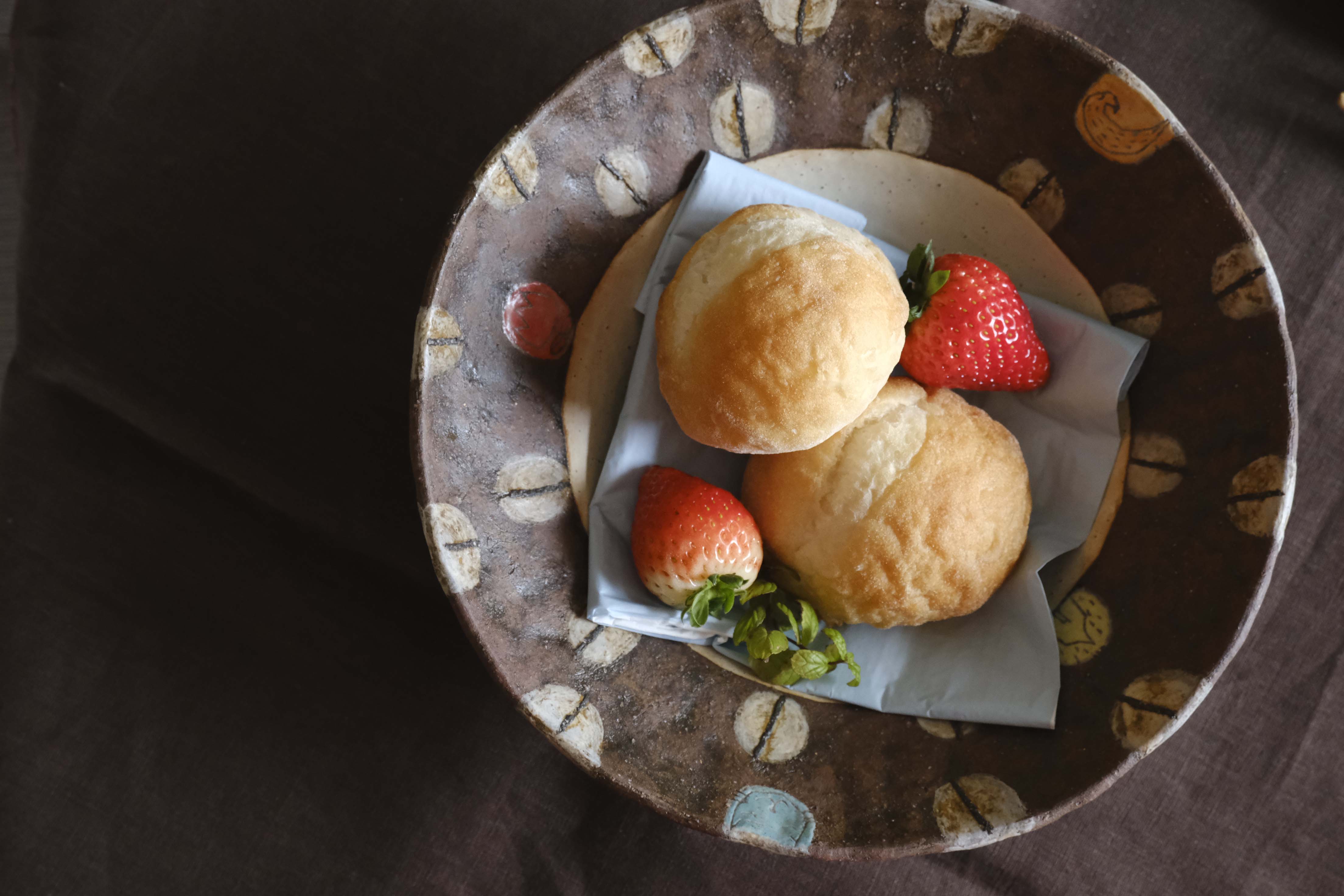 コーヒー豆の絵柄の中にカラフルなドット。ドットの中に線刻でいろいろなイラストが散りばめられています。ここにはこんな絵柄、ここにも!とぐるりと景色を楽しめます。使い手だけが堪能できる高台裏など、「お片付けまで頑張ったね」と褒められているよう。手びねりでキュッキュッと土を締めながら形成するので、手跡が感じられる凹凸も魅力です。太めのリムなので、どんぶりもののお料理も安心してサーブできますね。手触りは見込み部分はしっとりマット、茶色部分はザクっとマットです。