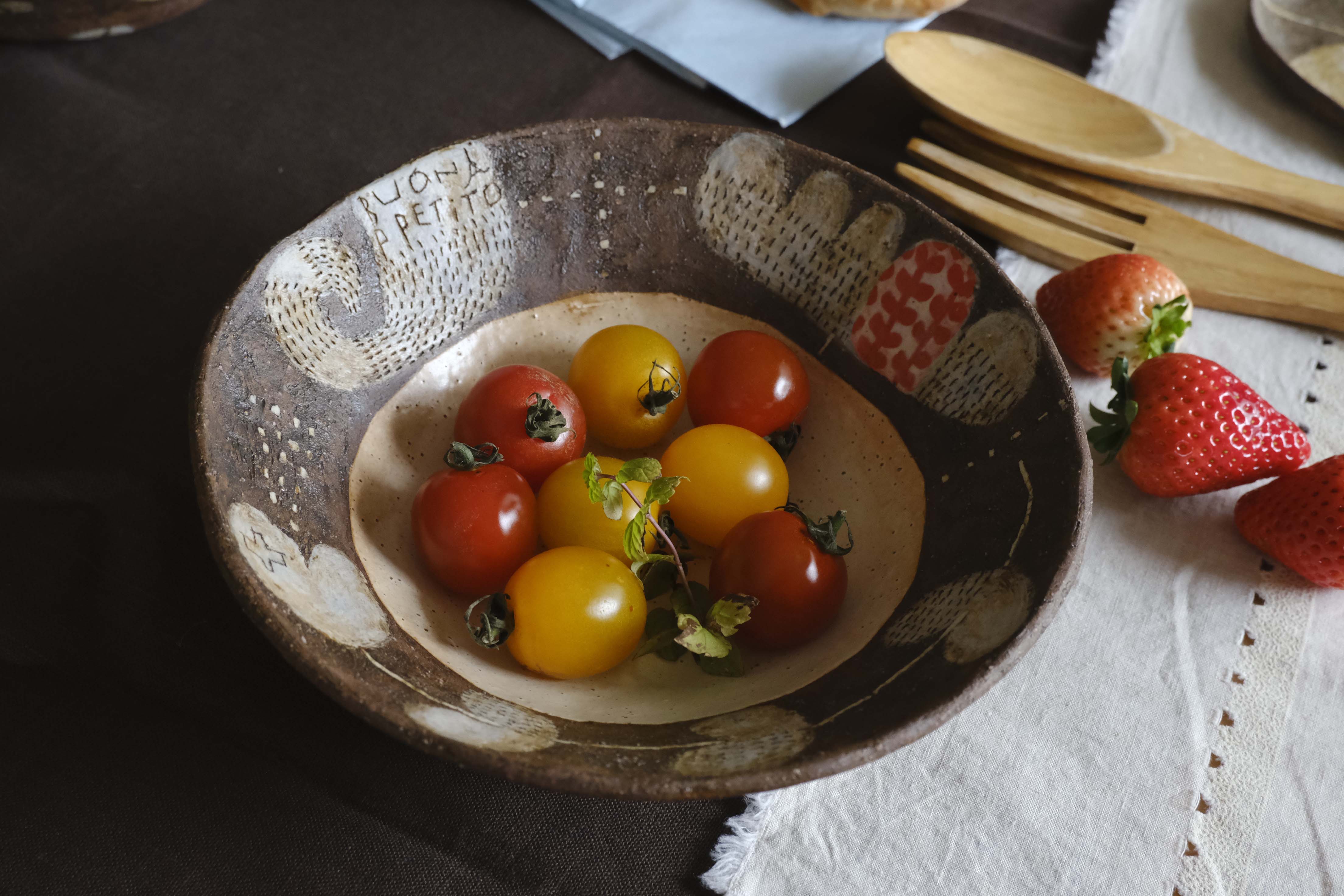 リムにぐるりと描かれた優しい絵柄。赤い葉の絵柄をポイントに比べて頂けると違いがわかりやすいです。また上からの写真はライトが光ってしまって見えにくい絵柄もあると思い、器の向きを変えて撮影していますので、拡大して細かい模様もご覧ください。側面もそれぞれ違いますが高台の写真を見て頂けるとどんな絵柄かを一度にご覧頂けます。手びねりでキュッキュッと土を締めながら形成した作家の手跡が感じられる凹凸も魅力です。見込み部分はしっとりマット、茶色のフチと側面はガサッとマットです。サラダやスープ、個々の煮込み料理などにもお洒落に使える一枚。