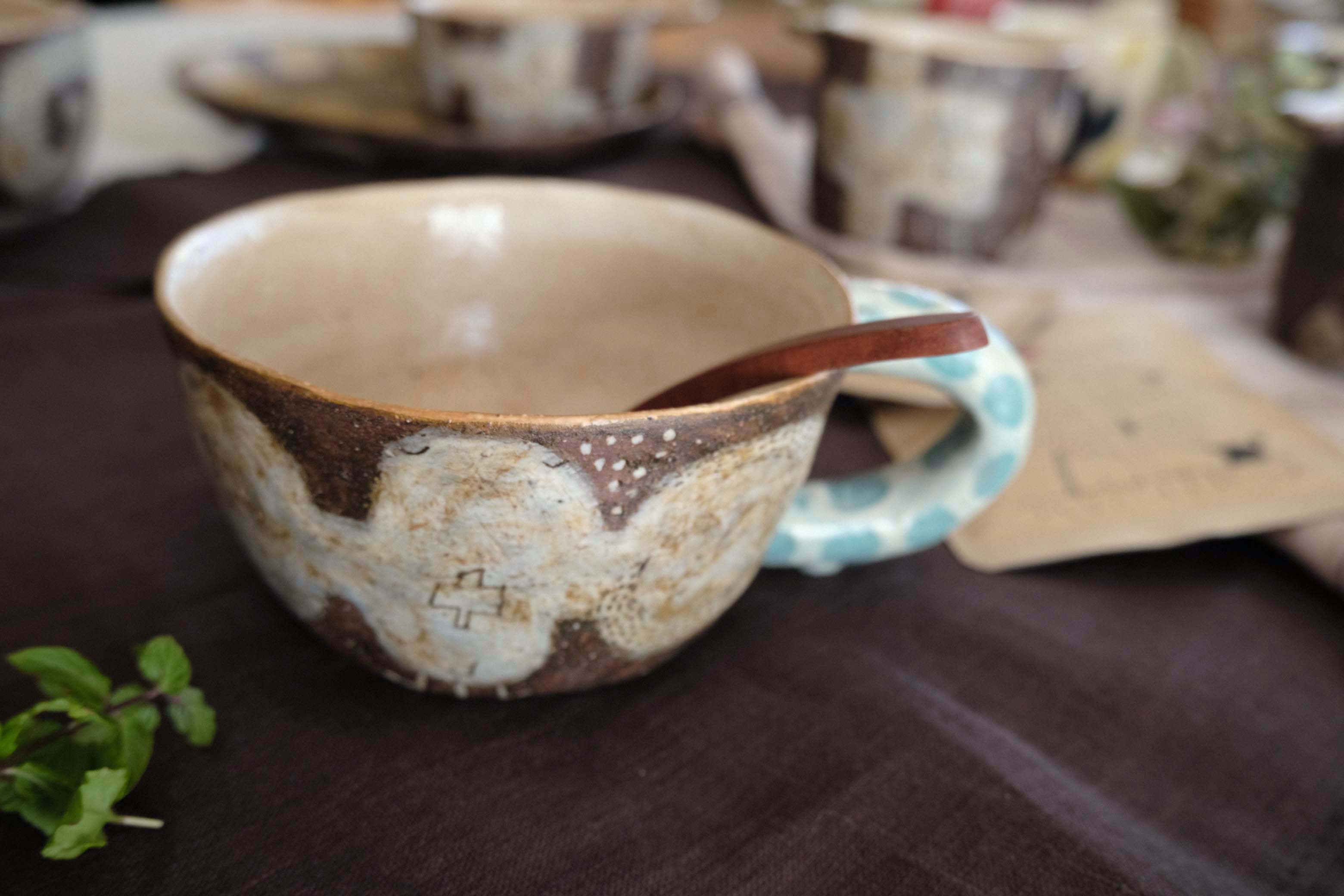 たっぷり400cc容量(満杯)の大きなカップは具沢山スープにもピッタリです。大きな器を支える大きな取っ手も特徴。制作時に下に下がらないように取っ手にぽちっと足がついています。ぐるりと可愛いイラストが描かれ、細かな線刻も素敵。飲み物だけではなく、フルーツや、サラダボウルにもいいですね。手触りは内側はマット、外側はガサっとマット。